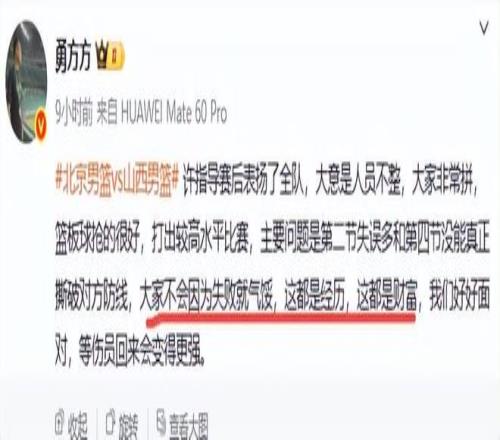 许利民真有意思,输给深圳队后,怒批队员耍大牌,吊儿郎当,昨晚却开起表扬会,把“失败”说成是“财富”,继“计划内输球”后又进步了,发现了“财富”一说。而球迷也纷纷调侃许利民,“4战3负 发大财了家人们无敌了”、“咱们这个赛季已经拥有五场财富了,继续加油积累财富,继续XJB换,XJB打!”、“积累财富?恭喜许指导又挣钱了!”最后球迷说,“每场比赛您老都是赢家!”、“你把这财富都带走吧”。