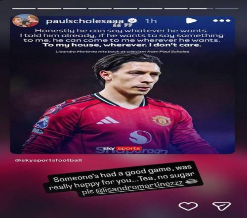 斯科尔斯随后在Instagram上回应,语气略带调侃:“有人这场踢得不错嘛,真心为你高兴。”还顺着利桑德罗的“登门邀约”打趣道:“要是来我家喝茶,记得别加糖。”