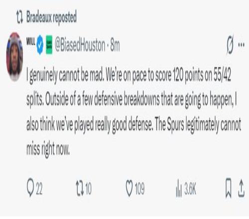 上半场打完火箭已经落后10分,休媒Will写道:我没办法为落后生气,因为我们朝着120分前进,除了几次防守漏人与失误我觉得我们做的不错,马刺就是怎么投怎么进。